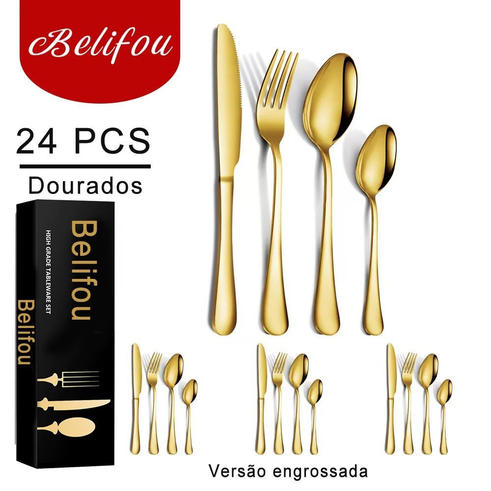 Belifou kit 16/24/32 jogo de talheres para bife aço inoxidável 416 dourados colher pequena – vesta