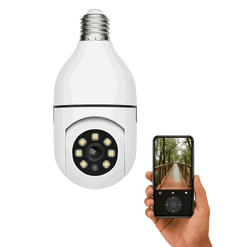 Câmera lâmpada wi-fi 360° panorâmica com visão noturna e controle celular – instalação rosqueável