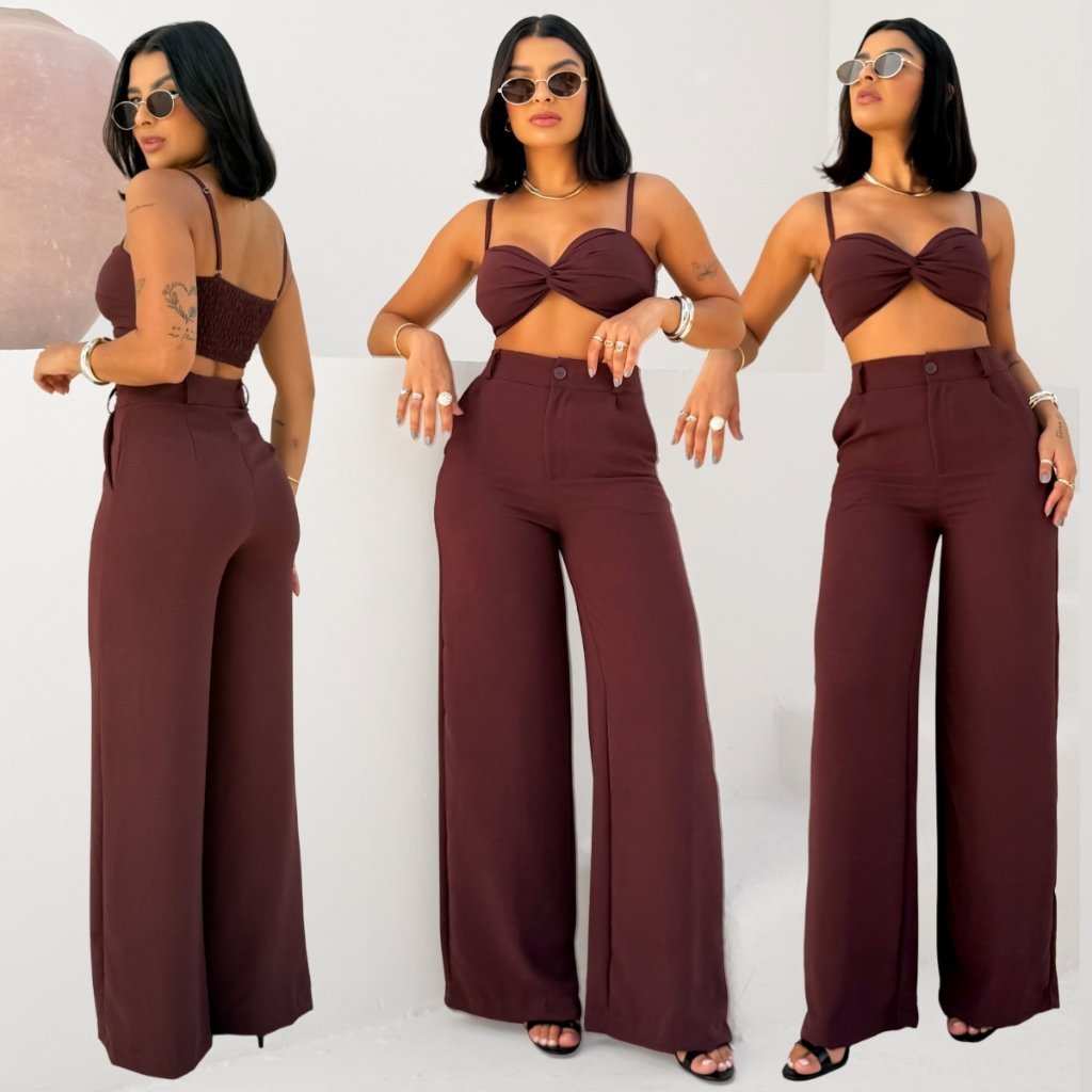 Conjunto top cropped de alça sem bojo e calça pantalona em duna helena marca lunii