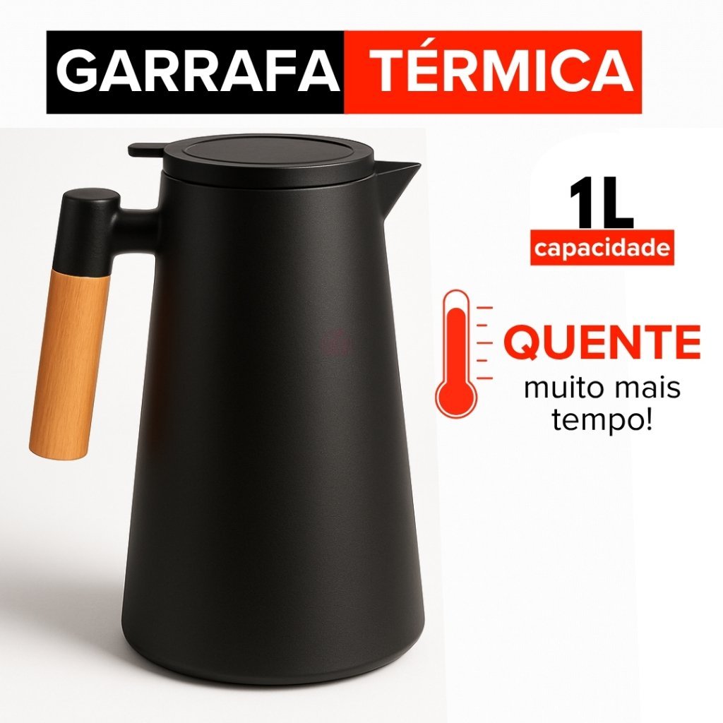 Garrafa térmica de café 1 litro preta cabo madeira e chá nórdica mantém quente