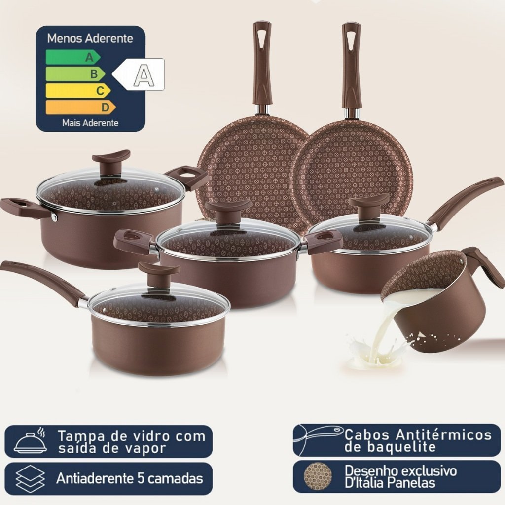 Jogo de panelas d’itália 10 peças disegno marrom antiaderente tampa vidro com desenho exclusivo