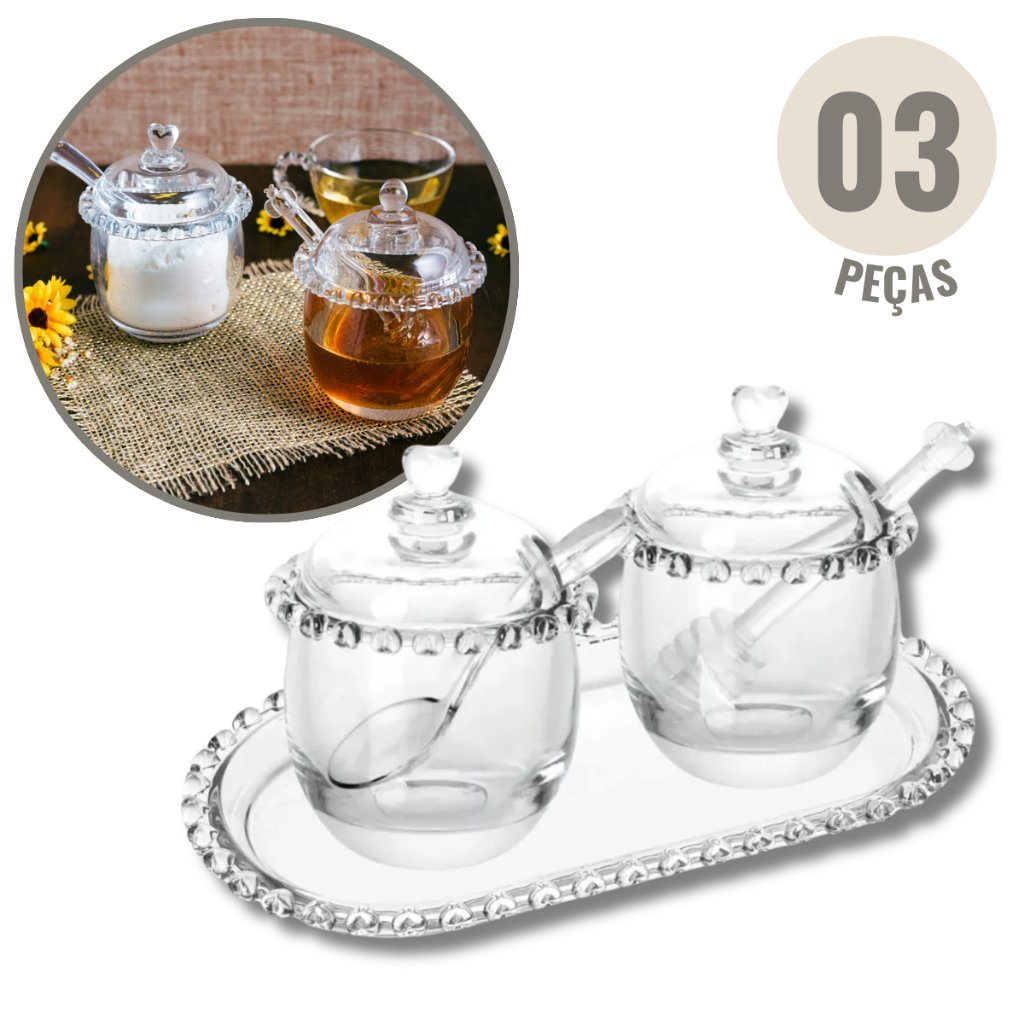 Kit açucareiro meleira travessa 3 peças coração bolinha em vidro lyor