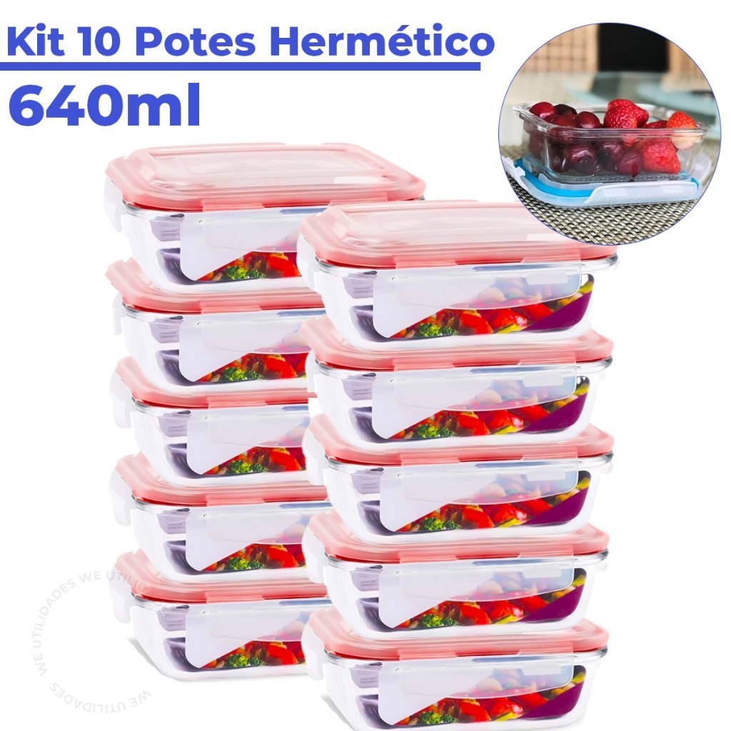 Kit pote de vidro hermético retangular 640 ml 5 ou 10 unid marmita microondas